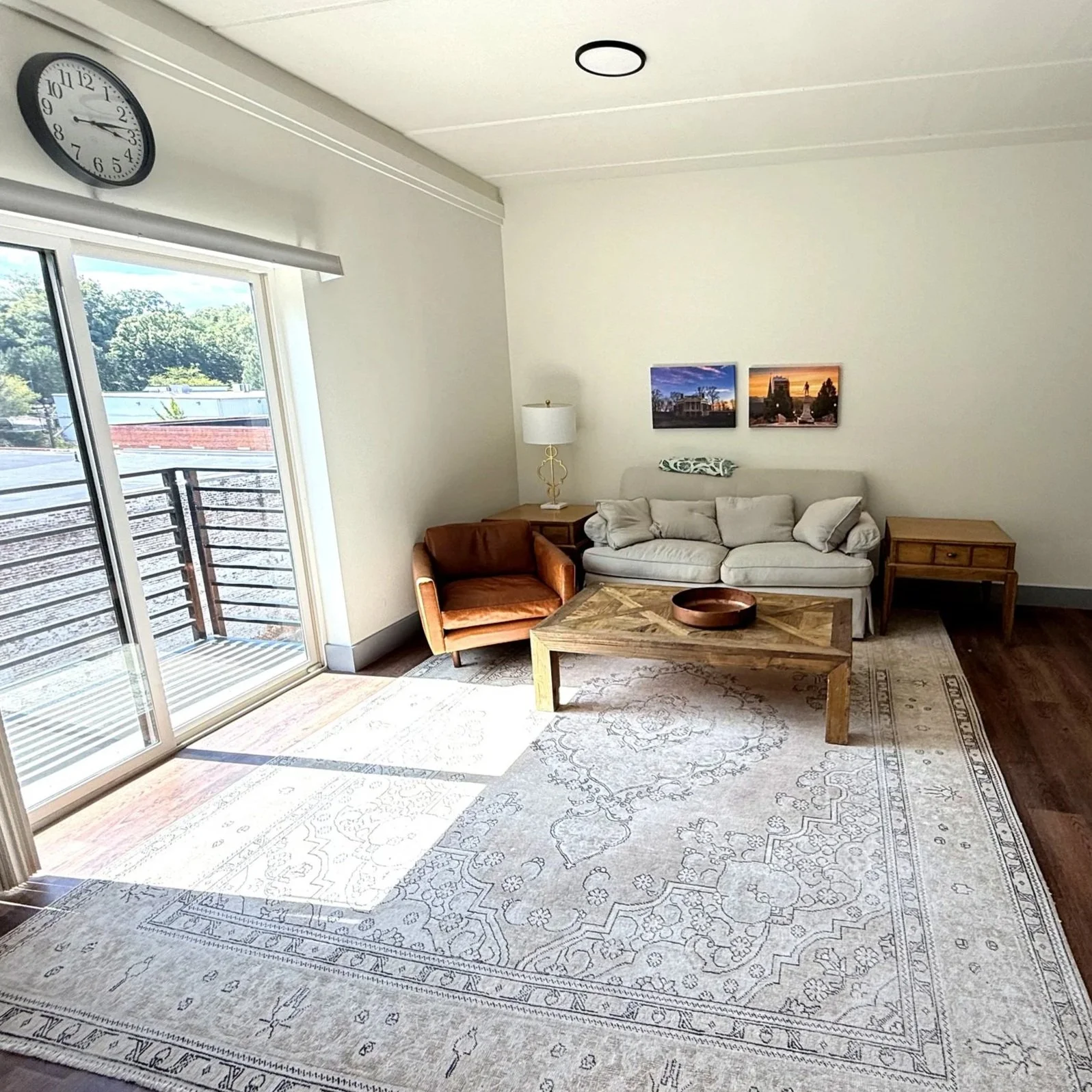Fully furnished one bedroom, 1.5 bath loft with an open living area and abundant natural light in Downtown Lynchburg. The space includes a modern kitchen with stainless appliances, granite countertops, and a large island, along with a bright living area, balcony access, and in unit laundry within walking distance to shops, dining, and city amenities.
