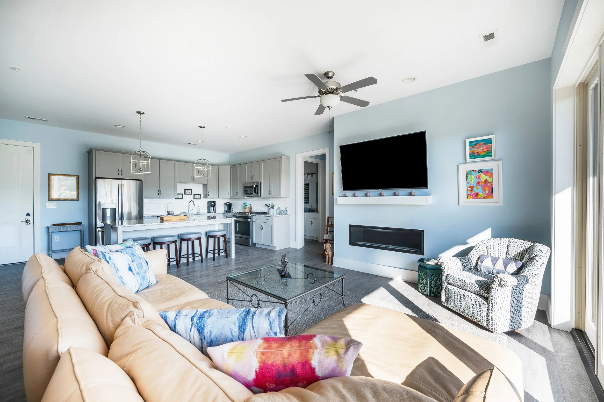 One-bedroom loft with a warm, boho feel, featuring an open living area anchored by a modern fireplace and large glass doors that fill the space with natural light and connect to the Bluffwalk. Includes a sleek kitchen with island seating and thoughtfully layered finishes throughout.